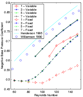 This section compares the results of calculations using variable- and fixed-time-period methods to show their relative merits. Two sets of data have been generated. The first set consists of all the spatial, temporal and Reynolds number permutations using the GBVTP method. The second set contains the exact same permutations as in the first, except that the time period is held fixed throughout the calculation. The Strouhal value for these calculations is derived from a curve fit based on Williamsons experimental data. Because the fixed-time-period calculations use the experimental Strouhal data, a comparison between these two data sets based on Strouhal number would simply replicate the results presented above. Instead the comparison will be based on the value of the base suction pressure coefficient, which is the negative mean pressure coefficient at the far leeward edge of the cylinder. The figures below show the base suction cofficient as a function of Reynolds number. Each subplot presents results from a different grid, while each line connects all the data points calculated using the same temporal resolution over a range in Reynolds numbers. In general, the difference between the NLFD and experimental datasets decreases as the Reynolds number decreases. Surprisingly, this difference on the finest mesh is smaller than the difference between the Henderson [R.D. Henderson. Details of the Drag Curve Near the Onset of Vortex Shedding. Physics of Fluids, 1995] results and the experimental data over the entire range in Reynolds numbers. Base Suction Coefficient vs Reynolds Number