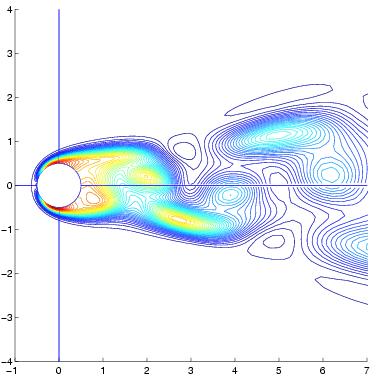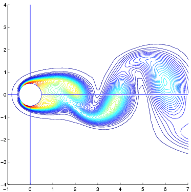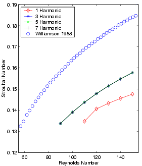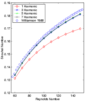 Vortex Shedding in Low Reynolds Number Flows Past Cylinders Laminar vortex shedding occurs behind a circular cylinder over a range of Reynolds numbers between 40 and 194. Unsteady vortices alternately shed from the leeward surface of the cylinder forming an ordered wake known as the von Karman vortex street. This page presents results from NLFD calculations of the cylinder test case and compares them with similar data from experiments and other numerical computations. Temporal and spatial resolution surveys are included to show the convergence these results exhibit as a function of diminishing numerical error. The temporal resolution survey covers four solutions using one, three, five and seven time varying harmonics. The flow field, as it exists in nature, obviously contains a larger number of modes. During the computation, these unresolved modes transfer energy back into lower frequencies in a corrupting process known as aliasing. This effect is a function of the magnitude of the unresolved modes, which are unknown in the absence of an exact solution. This resolution survey looks at solution changes with varying resolution in order to identify an answer that is independent of aliasing affects. The spatial resolution survey employs the four grids. To ensure a systematic search of the solution space, the survey computes every permutation of the four temporal and four spatial discretizations at 10 equally spaced Reynolds numbers within the range of Reynolds numbers admitting laminar vortex shedding. The results show that the relative magnitude of the higher harmonics grows with increasing Reynolds number. The changing distribution of energy between modes affects aliasing and further tests the capabilities of the NLFD method to accurately resolve the solution.