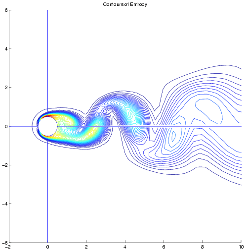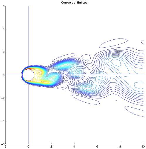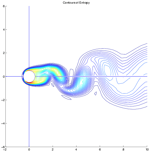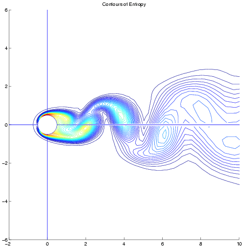 Provided below are entropy contours at the extremes in temporal resolution showing the qualitative difference in the solution with changing temporal accuracy. Because the energy contained in the higher harmonics increases with increasing Reynolds number these contours have been provided for the most challenging case; a Reynolds number of 150. Entropy Contours